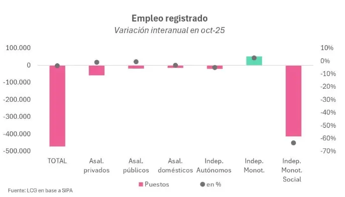 Un dato llamativo es que el retroceso se verificó en todas las modalidades laborales, incluido el monotributo, que hasta ese momento había mostrado mayor resistencia. También se registraron bajas entre los asalariados, tanto del sector público como del privado, y en el empleo en casas particulares. El único segmento que mostró una leve mejora fue el de los trabajadores autónomos.
