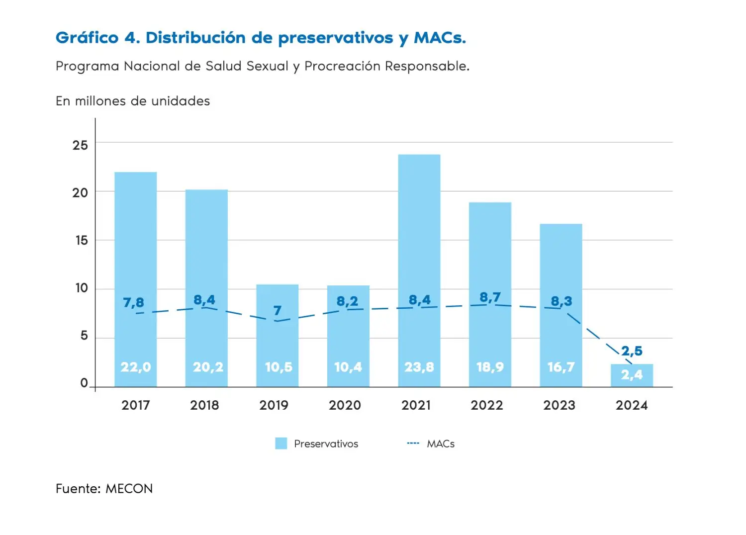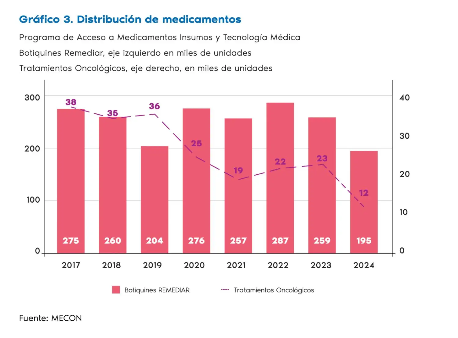 La contracción del presupuesto sanitario nacional también se manifestó en una reducción significativa en la distribución de medicamentos del programa REMEDIAR, disminución en la entrega de tratamientos oncológicos de alto costo y retrocesos en las políticas de salud sexual y reproductiva, con la reducción abrupta de entrega de métodos anticonceptivos (de unos 7,5 millones a 2,5 millones en 2024) y preservativos.