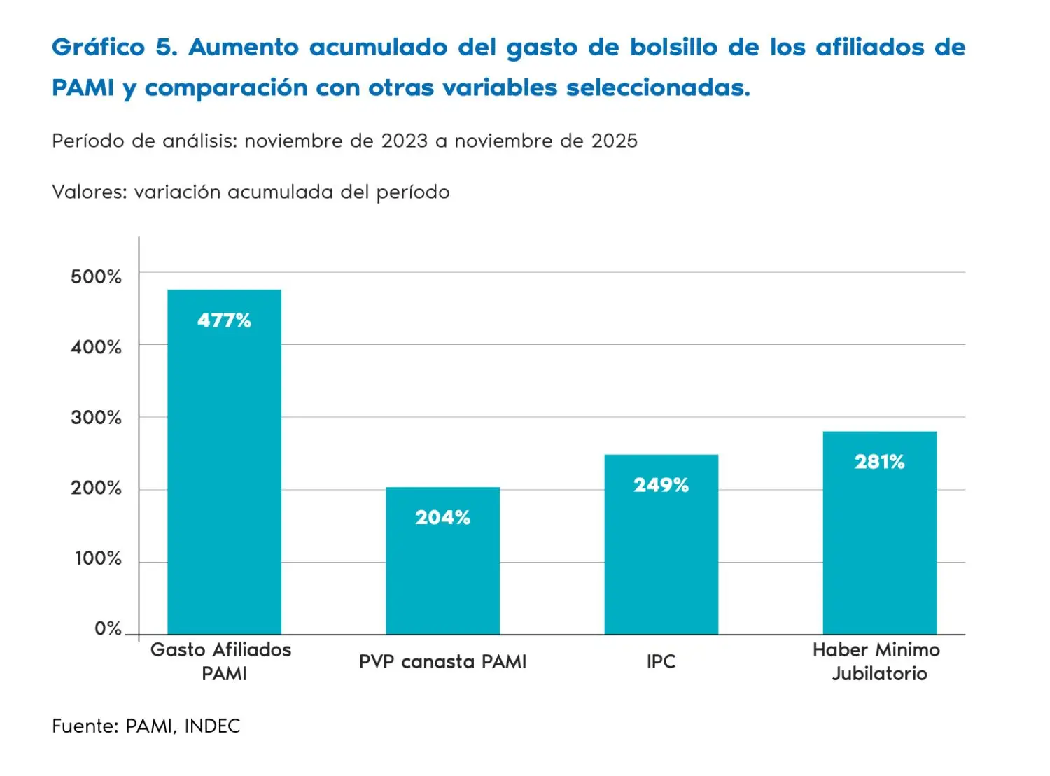 En cuanto a la cobertura de medicamentos del PAMI, como consecuencia de cambios en el precio de referencia y de la eliminación de coberturas plenas para medicamentos de uso frecuente, entre fines de 2023 y 2025, el gasto de bolsillo de los afiliados aumentó muy por encima de la inflación general y la evolución de los haberes jubilatorios. Una evidencia elocuente del impacto de estas estrategias es la caída sostenida del consumo de medicamentos bajo receta y de venta libre, particularmente entre los afiliados de PAMI.