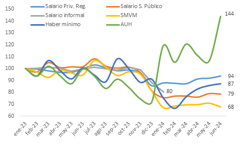 | El principal motivo por detrás de la caída (y el flojo repunte) de la actividad lo explica lo que está sucediendo con los ingresos que, a pesar de mostrar diferencias entre los distintos sectores, en todos los casos se observa que se encuentran por debajo de los niveles que tenían un año atrás.El gráfico a continuación resume la situación. Como se puede apreciar, en todos los casos se observa una fuerte caída con el cambio de gestión, debido más que nada a la aceleración inflacionaria que tuvo lugar durante los primeros meses del año (resultado de la drástica devaluación que aplicó Milei ni bien asumió). Luego se observa una tenue recuperación, que en ninguno de los casos logra recuperar el poder adquisitivo que tenían a principios del año pasado. El salario del sector privado registrado se encuentra 6% abajo, el haber mínimo 13%, el salario del sector público 21% y el salario mínimo vital y móvil 32% abajo (el salario del sector informal se encuentra 20% abajo, pero como su medición presenta un rezago importante, es probable que en los meses siguientes haya repuntado, al igual que el resto). Evolución de los ingresos en términos reales (100 = enero del 2023) |