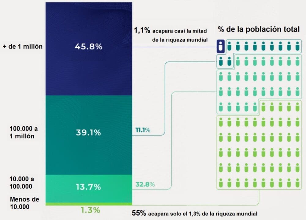 Pero la cosa se pone todavía peor si en lugar de examinar la distribución del ingreso nos enfocamos en la riqueza, es decir, el patrimonio acumulado a nivel mundial (activos financieros e inmuebles, principalmente). En este caso, vamos a utilizar un gráfico basado en el informe del Credit Suisse (los datos son similares, pero están presentados de una manera más elocuente). Como pueden ver, el 1,1% de la población ostenta casi la mitad de la riqueza mundial. Mientras que más de la mitad de la población prácticamente no cuenta con un patrimonio (menos del 2%). Oxfam lo pone de una manera todavía más cruda: ocho personas (ocho hombres en realidad) poseen la misma riqueza que la mitad más pobre de la población mundial, 3.600 millones de personas.