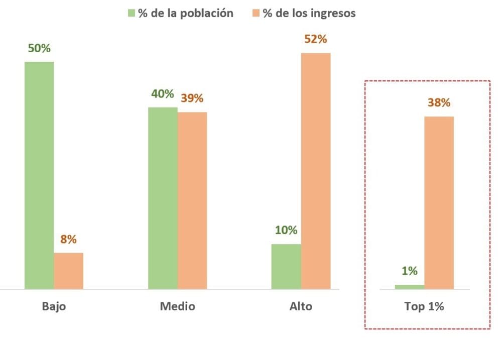 Como muestra el gráfico a continuación, la distribución del ingreso mundial es sumamente inequitativa. El 50% de la población mundial solo se lleva el 8% de los ingresos. Esto significa que, en promedio, la mitad del mundo gana unos USD 230 por mes, es decir vive con menos de USD 7 por día (medido a precios constantes). La población de ingresos medios se lleva el 39% del total y gana, en promedio, unos USD 1.215 mensuales, mientras que el 10% más rico se lleva el 52% del total y gana en promedio USD 7.300 mensuales. Esto significa que el 10% más rico gana, en promedio, treinta y dos veces más que la mitad (más pobre) del mundo.