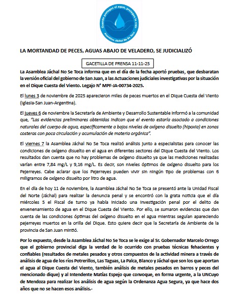 La Asamblea Jáchal No Se Toca informa que en el día de ayer aportó pruebas, que desbaratan la versión oficial del gobierno de San Juan, a las Actuaciones judiciales investigativas por la situación en el Dique Cuesta del Viento. Legajo N° MPF-JA-00734-2025. El lunes 3 de noviembre de 2025 aparecieron miles de peces muertos en el Dique Cuesta del Viento (Iglesia-San Juan-Argentina). El jueves 6 de noviembre la Secretaría de Ambiente y Desarrollo Sustentable informó a la comunidad que, “Las evidencias preliminares obtenidas indican que el evento estaría asociado a condiciones naturales del cuerpo de agua, específicamente a bajos niveles de oxígeno disuelto (hipoxia) en zonas costeras con poca circulación y acumulación de materia orgánica”. El viernes 7 la Asamblea Jáchal No Se Toca realizó análisis junto a especialistas para conocer las condiciones de oxígeno disuelto en el agua en diferentes sectores del Dique Cuesta del Viento. Los resultados dan cuenta que no hay problemas de oxígeno disuelto ya que las mediciones realizadas varían entre 7,84 mg/L y 9,16 mg/L. Es decir, son niveles óptimos de oxígeno disuelto para los Pejerreyes. Cabe aclarar que los Pejerreyes pueden vivir sin ningún tipo de problemas con 6 miligramos de oxígeno disuelto por litro de agua. Ayer 11 de noviembre, la Asamblea Jáchal No Se Toca se presentó ante la Unidad Fiscal del Norte (Jáchal) para realizar la denuncia penal y se encontró con la grata noticia que el día miércoles 5 el Fiscal de turno ya había iniciado una investigación penal por el delito de envenenamiento de agua en el Dique Cuesta del Viento. Por ello, se sumaron evidencias que dan cuenta de las condiciones óptimas del oxígeno disuelto en el agua mientras seguían apareciendo pejerreyes muertos en la orilla del Dique. Esto quiere decir que la Secretaría de Ambiente de la provincia de San Juan mintió. Por lo expuesto, desde la Asamblea Jáchal No Se Toca se le exige al Sr. Gobernador Marcelo Orrego que el gobierno provincial diga la verdad de lo ocurrido con pruebas técnicas fehacientes y confiables (resultados de metales pesados y otros compuestos de la actividad minera a través de análisis de agua de los ríos Potrerillos, Las Taguas, La Palca, Blanco y Jáchal que son los que aportan el agua al Dique Cuesta del Viento, también análisis de metales pesados en barros y peces del mencionado dique) y al Intendente Matías Espejo que convoque, en forma urgente, a la UNCuyo de Mendoza para realizar los análisis de agua según la Ordenanza Agua Segura, ya que hace dos años que no se hacen esos análisis.-