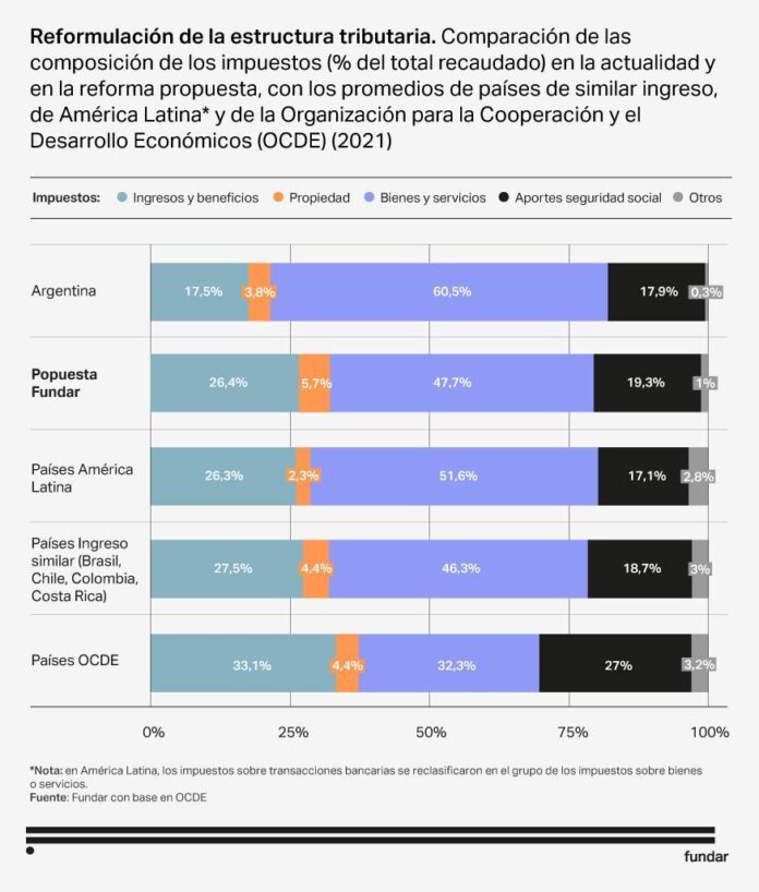 La estructura tributaria argentina tiene claramente una escasez de tributos directos, es decir, los que recaen directamente sobre las personas (como ganancias o bienes personales), y un exceso de tributos indirectos, es decir, los que recaen de manera indirecta sobre las personas a través, por ejemplo, del consumo o las ventas.